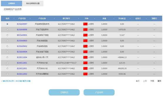 1、进入"投资理财->定期赎回"菜单主页面,"定期赎回"标签菜单页面上显示客户持有理财产品中允许进行定期赎回的产品列表,如下图: