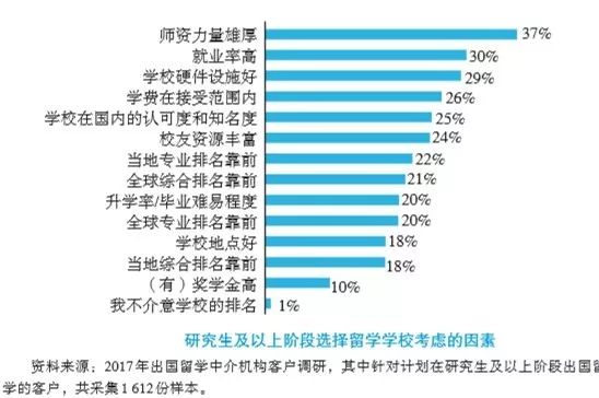 在研究生及以上阶段申请留学的学生希望在自己的专业领域进行深造,增加就业时的竞争力。校友资源的丰富程度也是研究生及以上阶段学生选择学校的主要考虑因素。学校在国内的认可度、知名度以及排名都对学生以后的就业有比较大的影响。毕业难度也是这一阶段的学生在申请学校时考虑的重要因素。