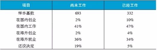 在调研的尚未工作的学生中,计划回国就业的学生较选择海外就业的略多;而在已经工作的学生中,计划回国工作的占多数。